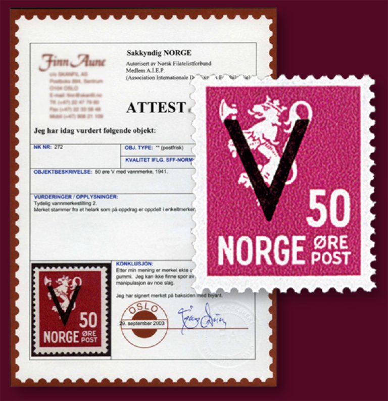 Vi leverer derfor dette frimerket sammen med en ekthetsattest fra attestatør Finn Aune, godkjent av Norsk Filatelistforbund.